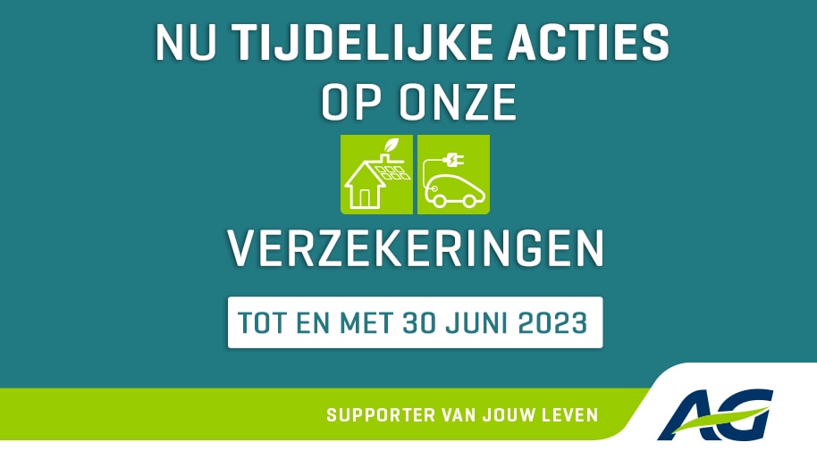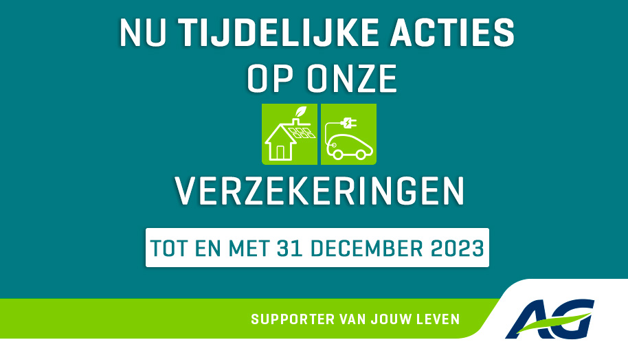 - Actie AG EcoBonus geldig bij het afsluiten (nieuwe zaak of verandering van voertuig) van een AG-verzekering BA Auto, en van een omniumformule voor een elektrisch of hybride voertuig in de klasse toerisme en zaken en vervoer van zaken tot 3,5t (buiten vloot). 10% korting op de jaarpremie voor BA en (mini) omnium zolang het contract niet wijzigt.