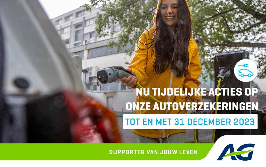 - Actie AG EcoBonus geldig bij het afsluiten (nieuwe zaak of verandering van voertuig) van een AG-verzekering BA Auto, en van een omniumformule voor een elektrisch of hybride voertuig in de klasse toerisme en zaken en vervoer van zaken tot 3,5t (buiten vloot). 10% korting op de jaarpremie voor BA en (mini) omnium zolang het contract niet wijzigt.