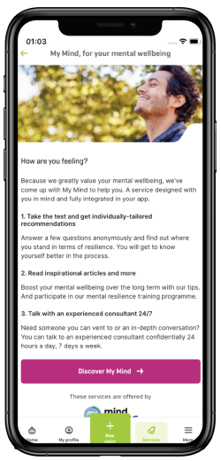 Test your mental resilience with My Mind by AG and boost it with inspiring articles and individually-tailored training modules. You can contact experienced consultants 24/7 via My Mind by AG.