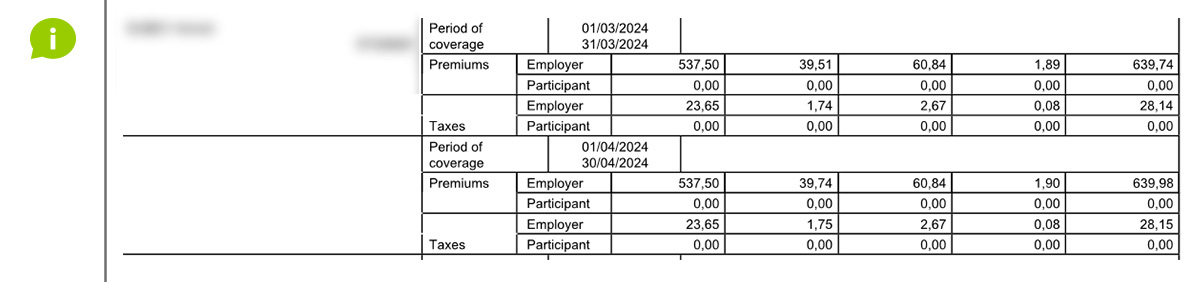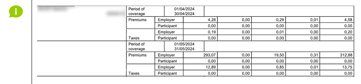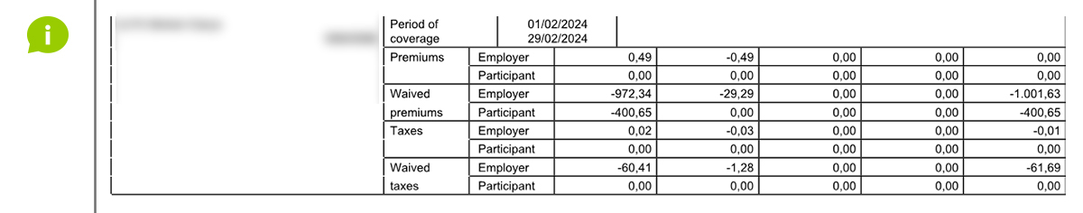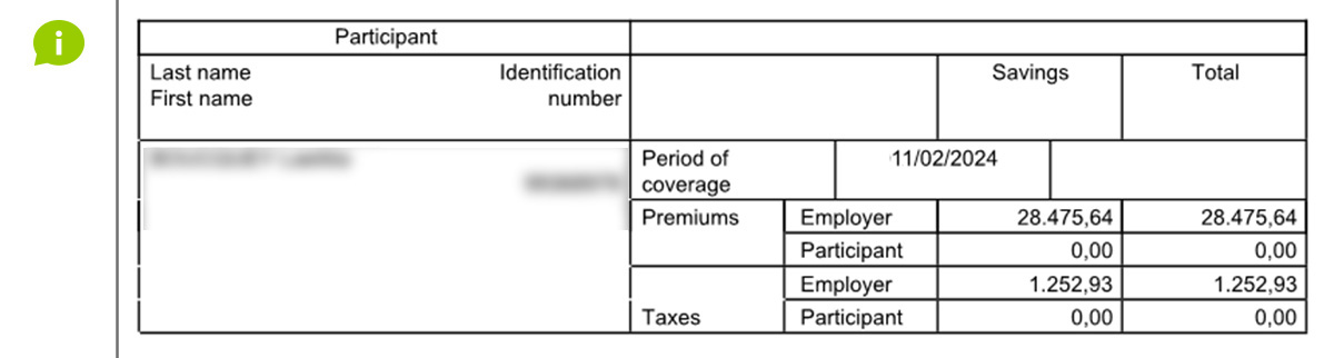 An "E-VOLULIFE" premium statement contains the premiums for the group insurance plan, per type of coverage: savings (supplementary pension), death, death by accident, disability and waiver of premiums.
