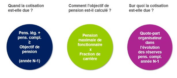 La cotisation est due si la somme de la pension légale et de la pension complémentaire du salarié ou de l'indépendant dépasse « l'objectif de pension » légal. Ce seuil est égal à la pension légale maximale du secteur public au 1er janvier de l'année précédente.