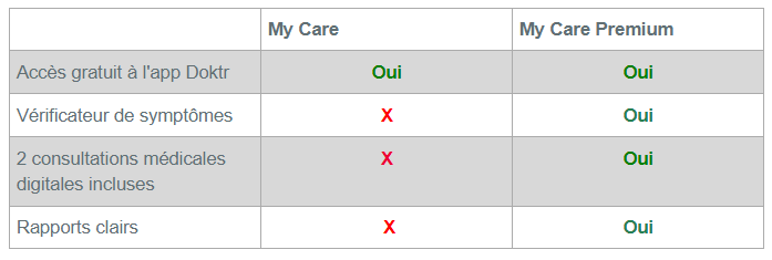 - Grâce à My Care Premium, vos collaborateurs ont accès 24h/24 et 7j/7 à un vérificateur de symptômes, ce qui les rassure dès qu'ils sont préoccupés par un mal physique. De plus, ils ont droit chaque année à deux consultations digitales gratuites chez un médecin généraliste belge reconnu.