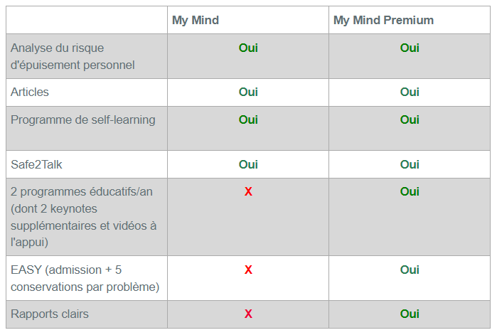 - Avec My Mind Premium, vos collaborateurs bénéficient de nombreux extras intéressants pour accroître leur résilience. De plus, ils peuvent contacter des professionnels pour toutes leurs questions et peuvent compter sur un accompagnement et un coaching personnalisés.