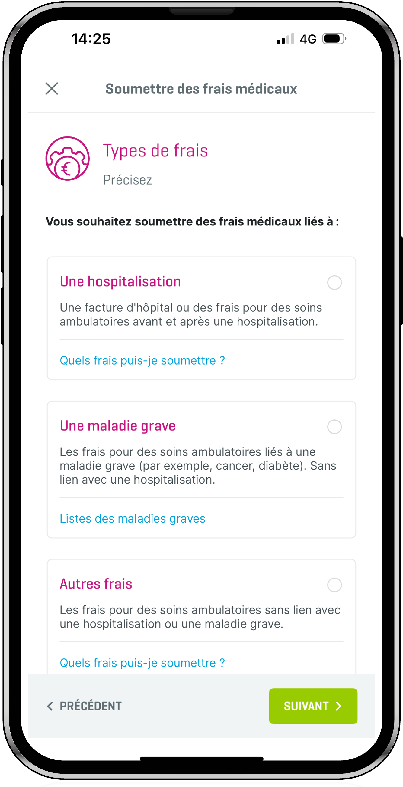 Cette catégorisation nous aide à traiter les sinistres avec plus de précision, et donc à procéder au remboursement plus rapidement. Le système envoie également un message d'erreur si votre employé envoie des frais qui ne sont pas couverts. Par exemple, les frais qui ne sont pas liés à une hospitalisation ne peuvent être transmis que si vous proposez une assurance soins ambulatoires.