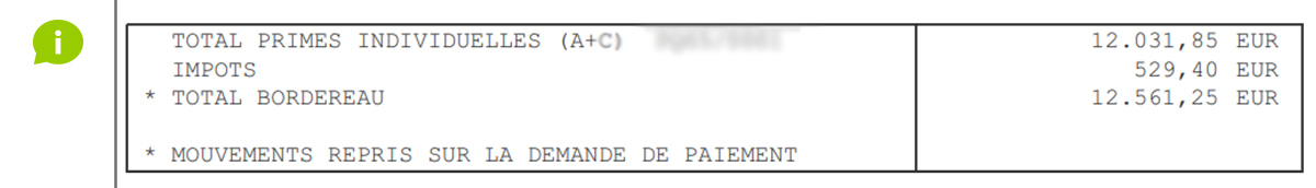 - Total bordereau : montant des primes + la taxe. Ce montant est repris sur la demande de paiement. Les éventuels frais, opérations du fonds, etc. sont également indiqués ici. Ne vous basez jamais sur les bordereaux pour payer, mais toujours sur la demande de paiement