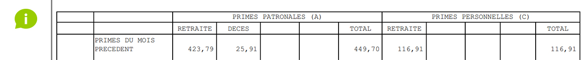- Primes liées au mois précédent = total des primes pour les personnes sans modifications dans le mois en cours.