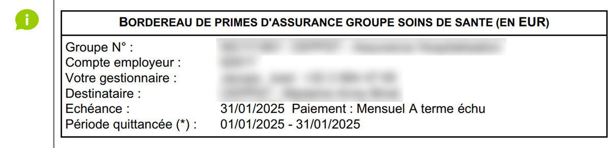 - Période quittancée : le mois auquel le bordereau de prime se rapporte. Cette date peut être différente selon la périodicité des primes.