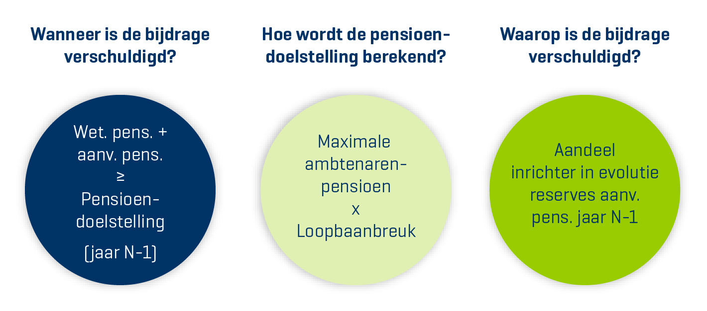 De bijdrage is verschuldigd als de som van het wettelijk pensioen en het aanvullend pensioen van de werknemer of zelfstandige de wettelijke ‘pensioendoelstelling’ overschrijdt. Die drempel is gelijk aan het maximum wettelijke pensioen van de openbare sector op 1 januari van het jaar ervoor.