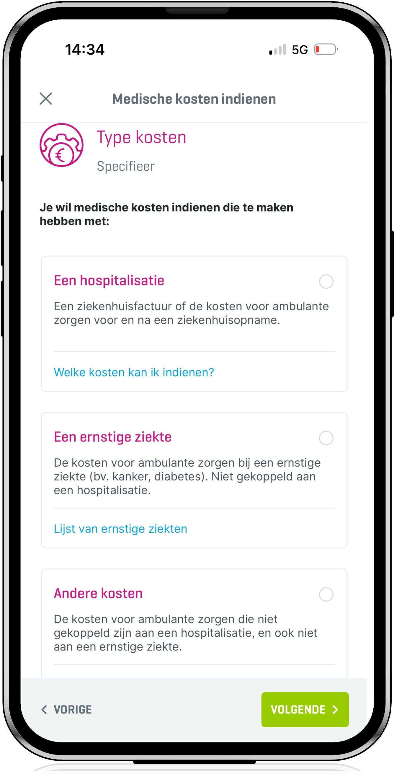 Deze categorisering helpt ons om claims nauwkeuriger te verwerken en dus sneller over te gaan tot terugbetaling. Het systeem geeft ook foutmeldingen wanneer een werknemer kosten indient waarvoor hij of zij niet gedekt is. Kosten die bijvoorbeeld losstaan van een hospitalisatie kunnen alleen worden ingediend indien u een verzekering voor ambulante zorgen biedt.
