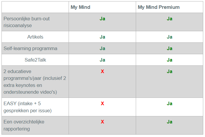 - Met My Mind Premium genieten uw medewerkers heel wat interessante extra's om hun veerkracht te verhogen. Bovendien kunnen met al hun vragen terecht bij professionelen én kunnen ze rekenen op persoonlijke begeleiding en coaching.