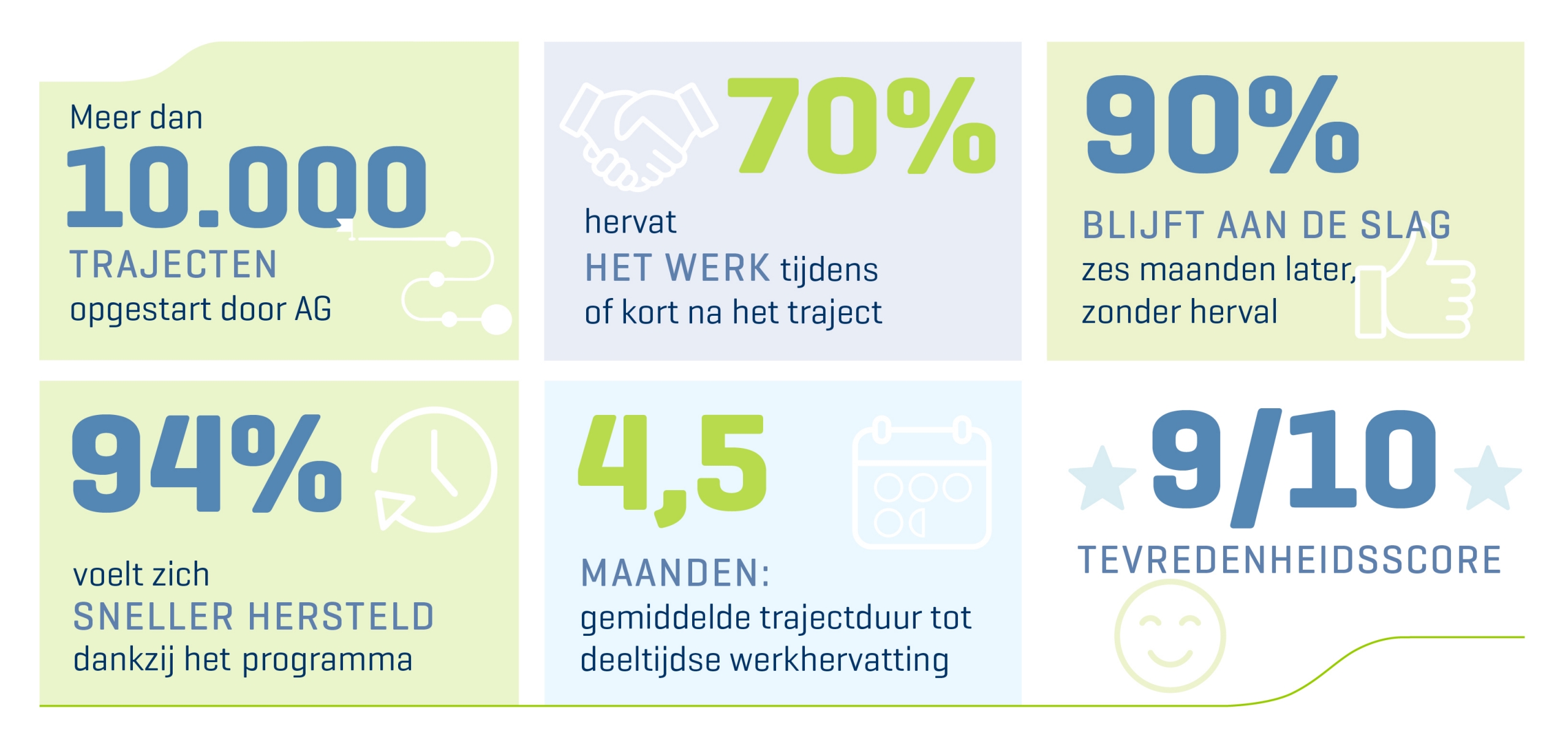 Met Return to Work hoeft u zelf niets meer op poten te zetten. Geen zoektocht, geen papierberg, geen giswerk. Als marktleider in professionele re-integratie sinds 2017 biedt AG deze kant-en-klare oplossing voor medewerkers die door een psychische aandoening langdurig uitvallen.