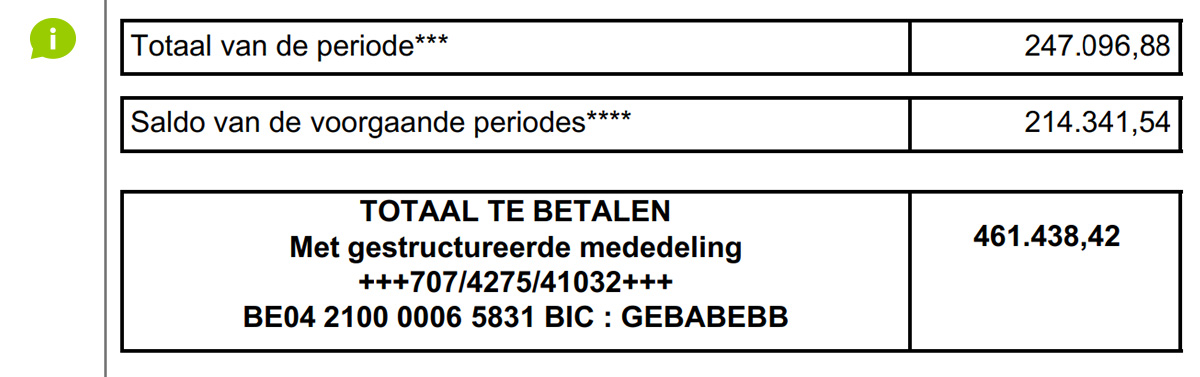 - Saldo van de voorgaande periodes: dit herneemt het totaal van de premies van de nog openstaande vervaldagen (van de voorbije maand(en)). Detail van deze voorgaande periodes vindt u dan terug onder de 4 sterretjesĀ
