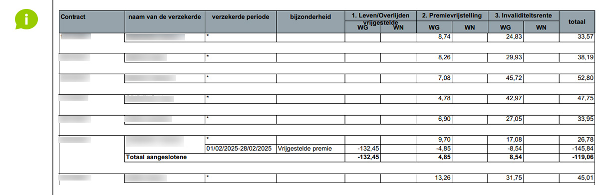 - Vrijgestelde premie: hier ziet u welke premies leven/overlijden er vrijgesteld worden en voor welke periode