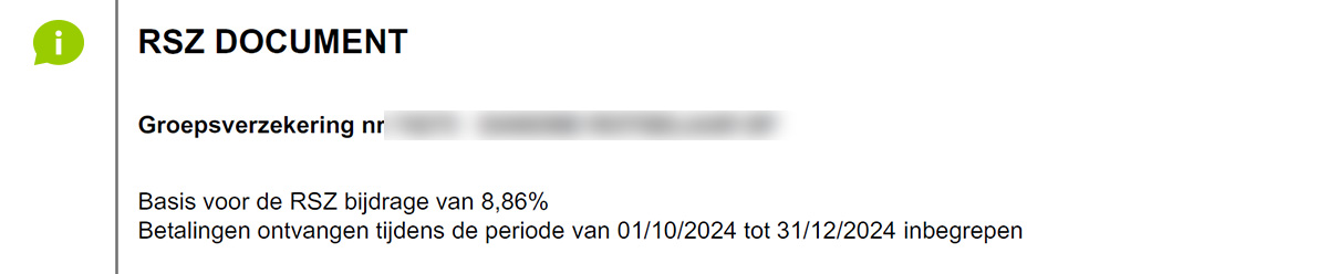 - Betalingen ontvangen tijdens de periode van xxx tot xxx inbegrepen: enkel de premies die in dit trimester effectief betaald zijn, worden op het document hernomen. Als u de opgevraagde premies voor september 2024 op bv 21/10/2024 betaalt, dan worden deze bedragen hernomen op het RSZ-document van het 4de kwartaal 2024 en niet op dat van het 3de kwartaal.