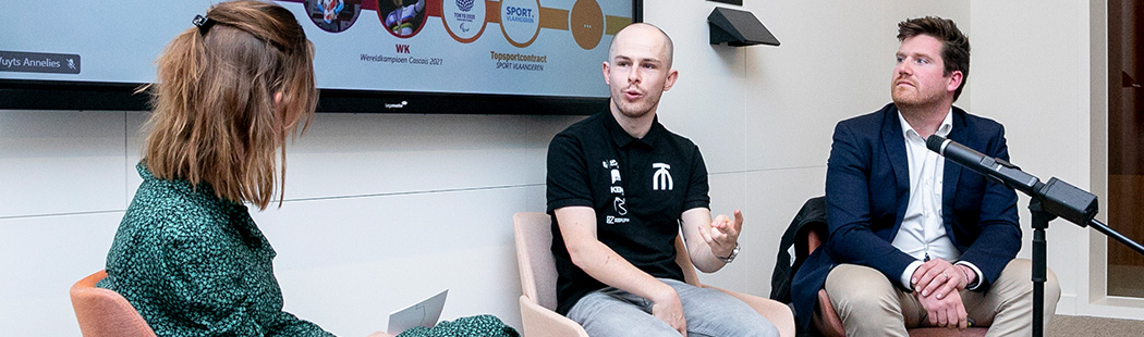 Un peu timide, le champion de paracyclisme Tim Celen entre dans la salle du tout nouveau Campus AG.À ses côtés : Remko Meeusen. Son entraîneur, coach, motivateur, scientifique du sport, manager et ami. « Je suis proche de Tim à tous les niveaux », dit Remko.