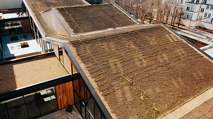 - En dan het zichtbaarste duurzaamheidsaspect van AG Campus: het dak van de AG Campus is groen. Dat is niet alleen mooi, maar ook functioneel: het biedt een natuurlijke geluidsisolatie, heeft een positief effect op de temperatuur, zorgt voor minder CO2-uitstoot en vervuiling, en is gunstig voor vogels en bijen.