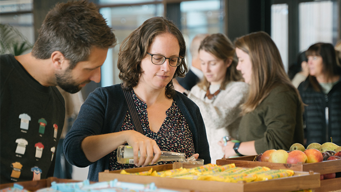 Onder de middag mag het al eens wat actiever zijn. En dus konden de medewerkers van AG zelf aan de slag in verschillende workshops. Altijd al willen weten wat duurzame mode is en hoe je het kan herkennen? In de workshop ‘Hoe maak je je kleerkast duurzamer’ kregen de geïnteresseerden een heleboel praktische tips mee voor hun volgende shoppingtrip. En van de kleerkast meteen door naar de keuken voor de volgende workshop. Met eerst en vooral een antwoord op de vraag ‘wat is een afvalvrije keuken?’ Een uur lang maakten de aanwezige collega’s kennis met de waarheden en onwaarheden rond bewuster inkopen, recycleren en afvalvrij koken.
