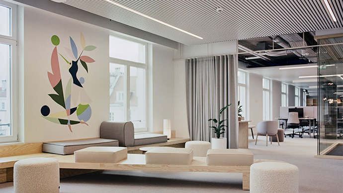 - Daarnaast zijn er de Collective Spaces. Dat zijn vergaderzalen die speciaal zijn uitgerust voor hybride vergaderingen. Zo betrek je de collega’s die thuiswerken naadloos in je vergadering. Verder zijn er nieuwe opleidingsruimtes, agile vergaderplekken en zelfs zaaltjes met een sofa, ideaal voor een brainstorm.