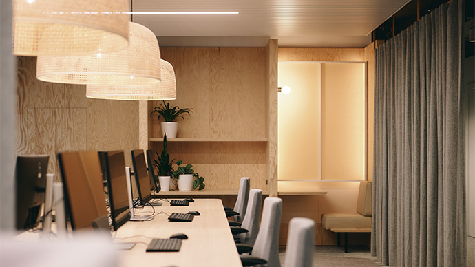 - De Team Spaces. Hier vind je klassieke werkplekken, maar ook lange projecttafels waar je met je collega's kan gaan zitten, bubbles voor dat belangrijk telefoontje of zit-stabureaus.