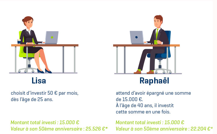 Dans les deux situations, Lisa et Raphaël investissent le même montant, mais le résultat au 50ème anniversaire est complètement différent ! Si Lisa commence à 25 ans avec un versement mensuel de 50 euros, elle disposera d'un capital de 25.526 euros à son 50ème anniversaire. Raphaël, le quadragénaire qui a investi 15.000 euros, verra son investissement passer à 22.204 euros.