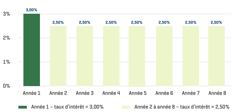 • Pour les 7 années suivantes, l’épargne accumulée bénéficie d’un taux d’intérêt garanti de 2,50 %.