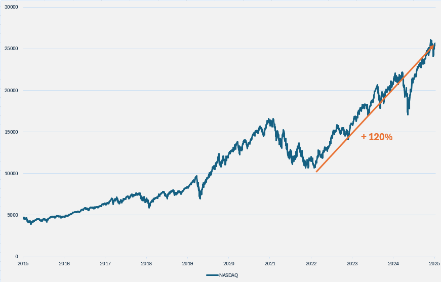 La valorisation importante du secteur des technologies Outre-Atlantique est souvent comparée à celle qui mena à l’explosion de la bulle internet en 2000-2002, la célèbre crise des Dotcom. Le parallèle est frappant : même secteur, et même envolée fulgurante des cours.