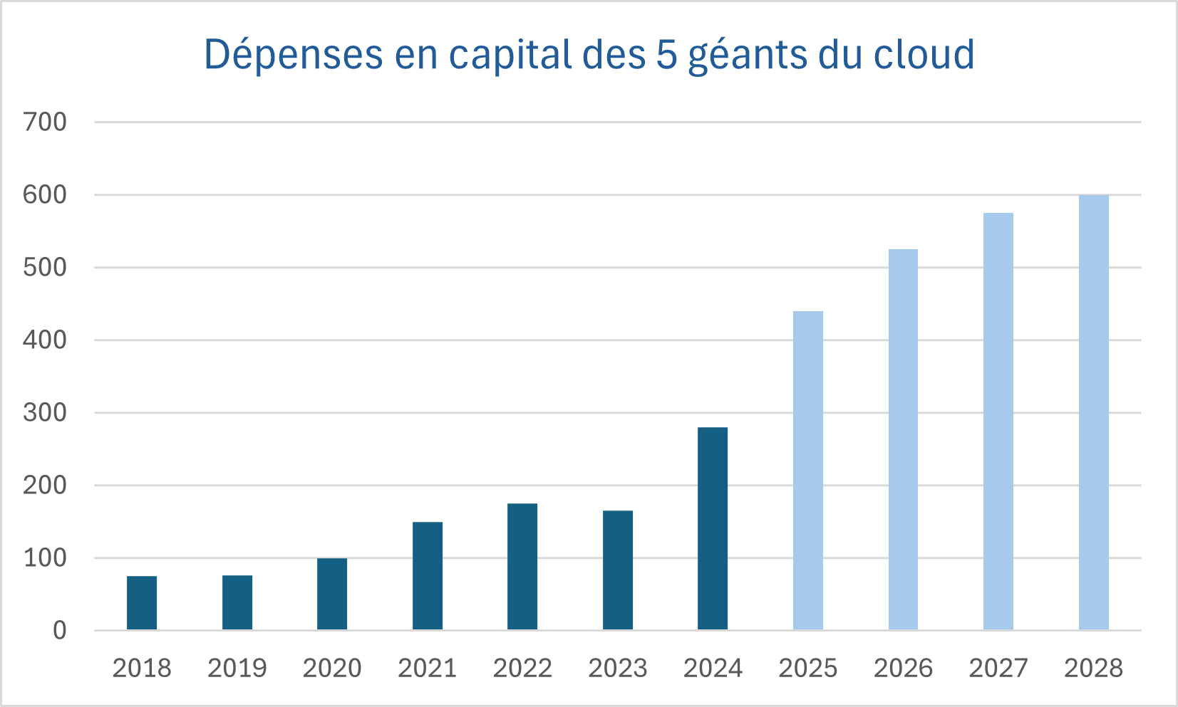 Rien que cette année, 450 milliards de dollars devraient être investis dans l’IA. D’abord dans les semi-conducteurs, ensuite dans les datacenters et enfin, dans les infrastructures nécessaires à l’IA générative : une capacité colossale de datacenters (cloud[3])