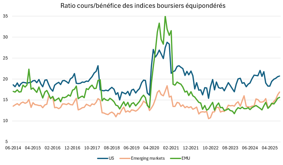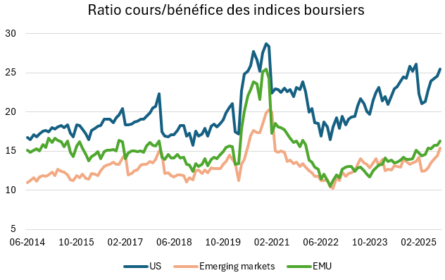 Ces solides performances se traduisent par une hausse des valorisations. Les ratios cours/bénéfice ont augmenté, surtout aux Etats-Unis, et l’écart avec la zone EUM ou les pays émergents est considérable, ce qui suggère une surévaluation du marché.