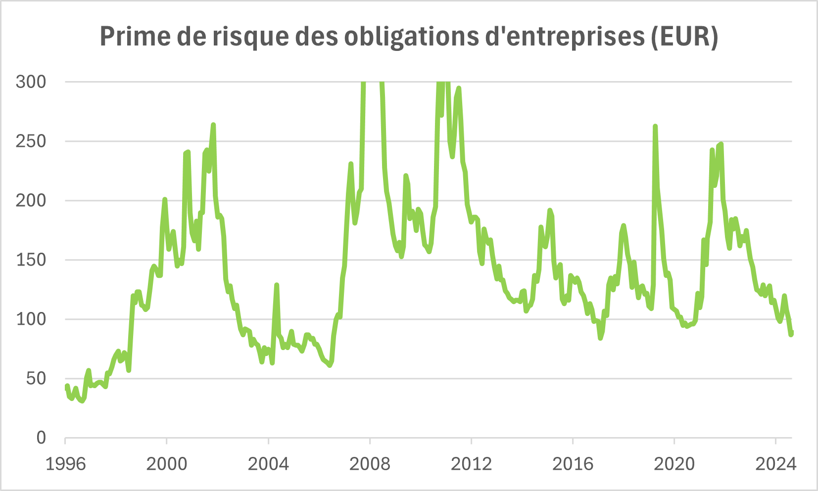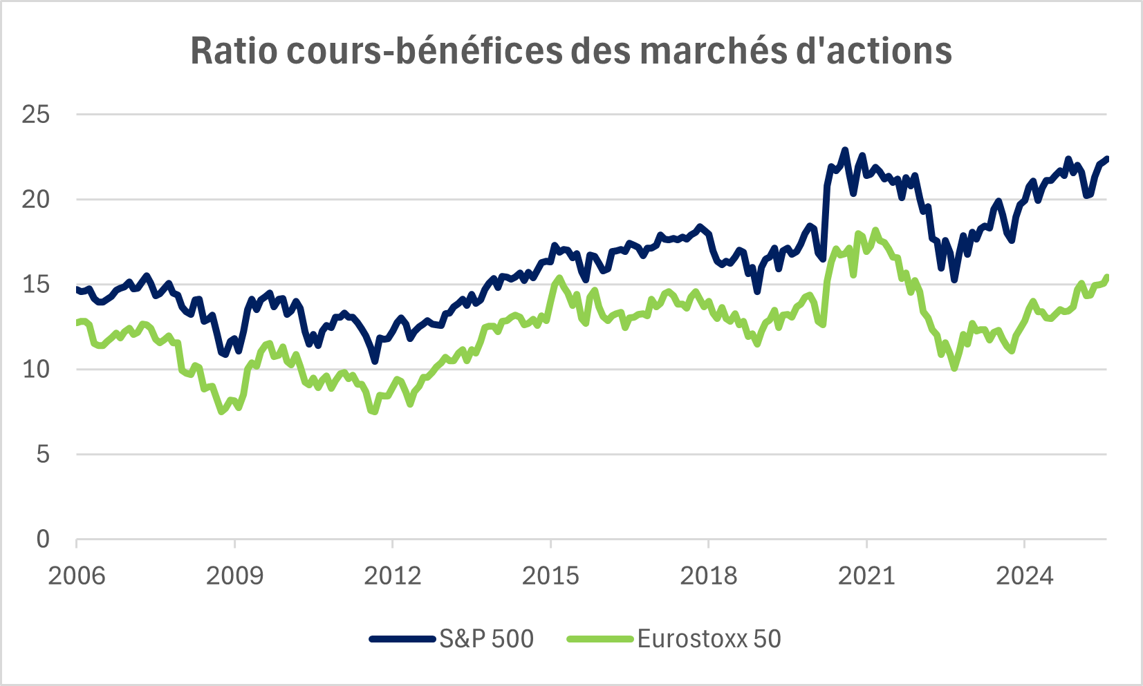 Après la hausse observée au cours des derniers mois, les valorisations des marchés boursiers ont continué à progresser. Le marché boursier américain est carrément cher avec un ratio cours-bénéfice de 22 - contre une moyenne historique de 16 (voir graphique 2). La valorisation des actions européennes est tout à fait correcte (ratio cours-bénéfice de 14,6 contre 13,2 en moyenne), mais les résultats restent quelque peu décevants. En raison de valorisations plus onéreuses et de l'incertitude politique, nous avons récemment quelque peu réduit nos positions en actions, tant aux États-Unis qu'en Europe. Compte tenu de notre scénario relativement positif d'un atterrissage en douceur et de taux d'intérêt stables à inférieurs, toute correction de prix nous semble être une opportunité d'achat pour les investisseurs à long terme.