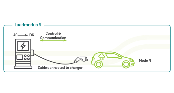 Bij laadmodus 4, gebeurt de omzetting van wisselstroom naar gelijkstroom in het laadstation zelf.