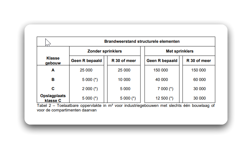 De oppervlakte van de gecompartimenteerde ruimte wordt immers bepaald in functie van de klasse, de brandwerendheid van de bouwelementen en de aan- of afwezigheid van een sprinklerinstallatie.