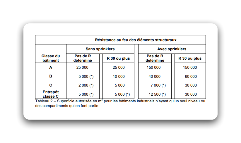 En effet, la superficie du local compartimenté est établie en fonction de la classe, de la résistance au feu des éléments structuraux et de la présence ou non d’une installation de sprinklers.