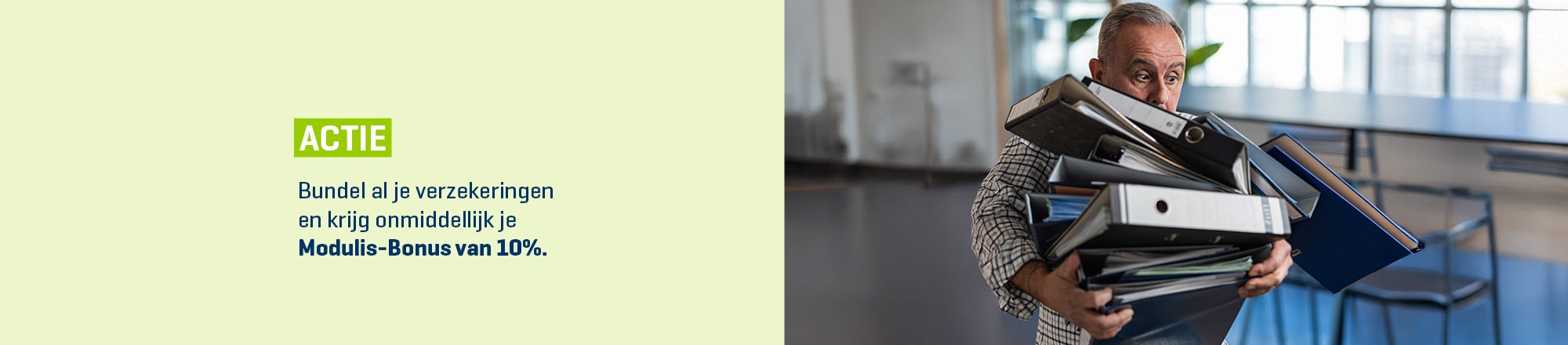 Twijfelt u nog over bepaalde verzekeringen of wil u later nog een extra verzekering toevoegen? Geen probleem, want ieder extra contract dat u in 2025 of 2026 toevoegt aan het nieuwe Modulis-dossier, komt in aanmerking voor de Gegarandeerde Modulis-Bonus tot eind 2026. Dat geldt voor zowel bestaande contracten als nieuwe contracten die toegevoegd worden aan het Modulis-dossier. - Op welke producten geldt de actie?