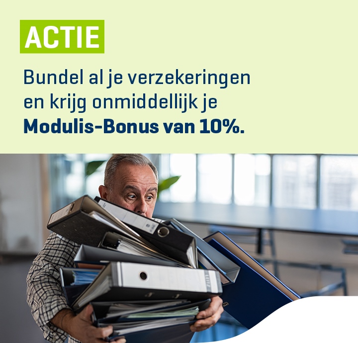 Onderschrijf een Modulis-dossier dat in werking treedt in de periode van 2 januari 2025 tot en met 1 januari 2026 en u ontvangt onmiddellijk een gegarandeerde Modulis-Bonus van 10% op de premies voor de periode vanaf onderschrijving tot en met 31 december 2026. - Later nog contract(en) toevoegen? Ook daarop geniet u de Bonus.