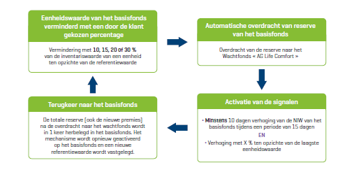 De premies worden aanvankelijk geïnvesteerd in het basisfonds. Bij een daling van meer dan x% (10, 15, 20 of 30% naargelang uw keuze) van de netto-inventariswaarde van dit fonds t.o.v. de vastgelegde referentiewaarde, wordt de reserve automatisch belegd in een defensiever wachtfonds, AG Life Comfort, tot de volgende kalme periode. Gedurende die tijd worden de in het basisfonds voorziene toekomstige premies ook geïnvesteerd in het fonds AG Life Comfort.