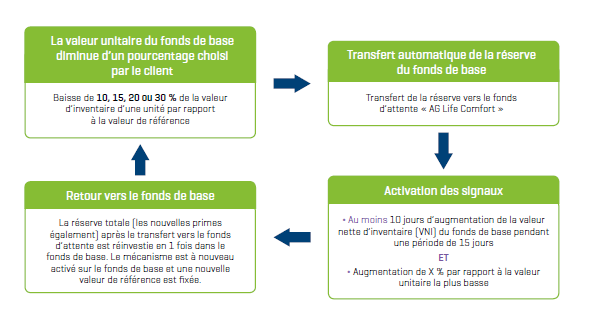 Les primes sont investies dans le fonds de base dans un premier temps. Ensuite, en cas de baisse de plus de x % (10, 15, 20 ou 30 % selon votre choix) de la valeur nette d'inventaire de ce fonds par rapport à la valeur de référence déterminée, la réserve est automatiquement placée dans un fonds d'attente plus défensif, AG Life Comfort, jusqu'à la prochaine accalmie. Pendant ce temps les primes futures prévues dans le fonds de base sont également investies dans le fonds AG Life Comfort.